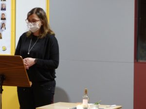 Lisa Wagenpfeil (Klasse 10d) spielte stimmungsvolle Weisen auf dem E-Piano, während die Religionslehrerinnen jeweils die erste Adventskerze aller mitgebrachten Adventskränze anzündeten, sodass die Klassensprecher das Adventslicht zu ihren Mitschülern in die Klassenzimmer bringen konnten.