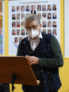 Seit Direktor Oliver Sailer an der Schule ist, ist es guter Brauch, dass sich das Bläserensemble im Sekretariat der Schule versammelt, um über die Lautsprecheranlage die adventliche Zeit im ganzen Schulgebäude zu verkünden. Dieses Mal bestand das Ensemble – den Zeitumständen geschuldet – nur aus zwei Personen: Schulleiter Oliver Sailer auf der Trompete und Musiklehrer Hans Rimböck auf dem E-Piano spielten die internationalen Weihnachtslieder „Hark! The herald angels sing“ und „Les anges dans la campagne“.