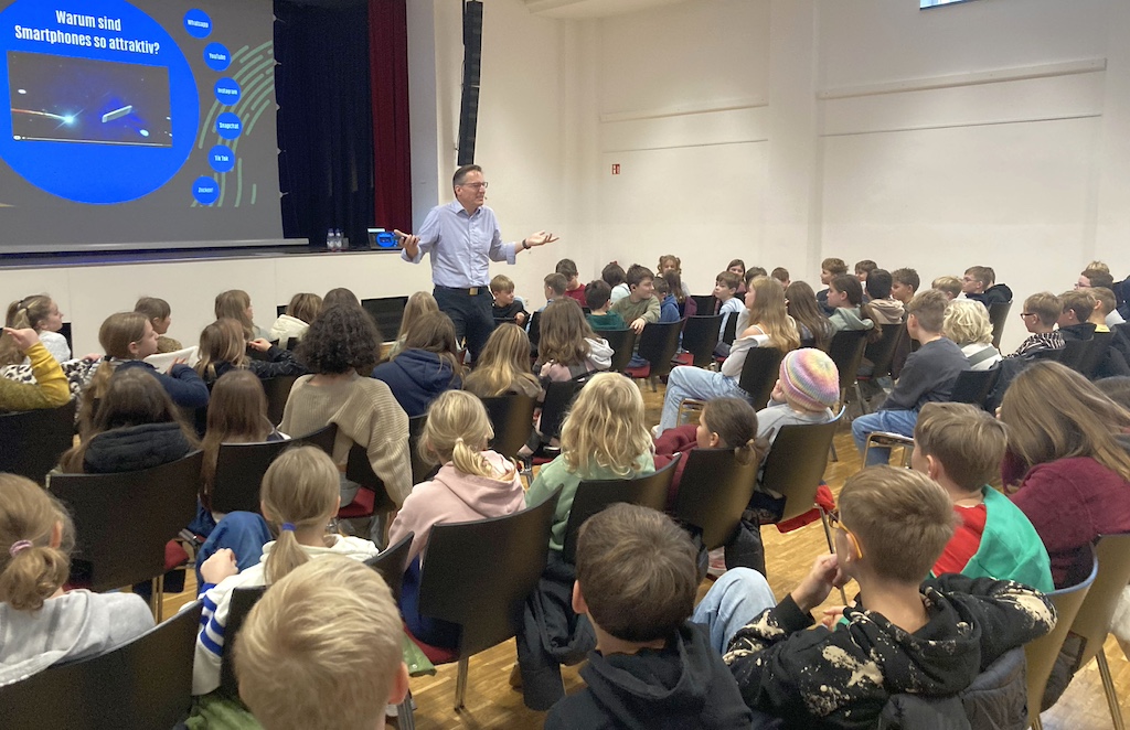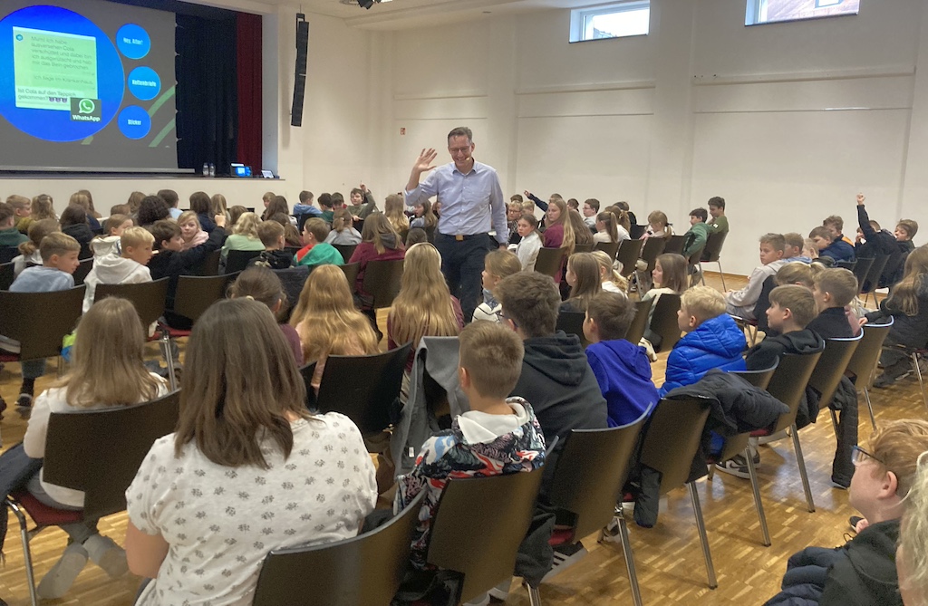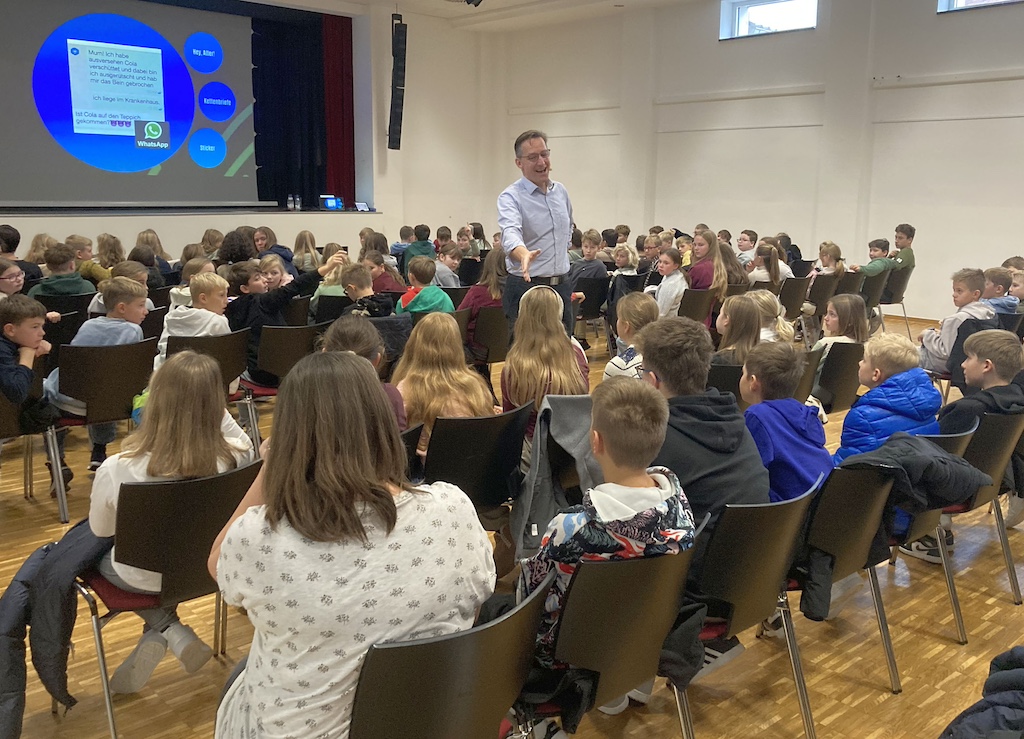 Beim Workshop für die 5. und 6. Klassen ging es darum, dass die teils exzessive Nutzung und der Konsum altersunangemessener Inhalte gerade bei jüngeren Kindern u.a. häufig zu Bewegungsmangel, Cybermobbing und Social-Media-Sucht führt. Im Speziellen ging er dabei näher auf die negativen Folgen der beliebten Klassenchats in WhatsApp ein.