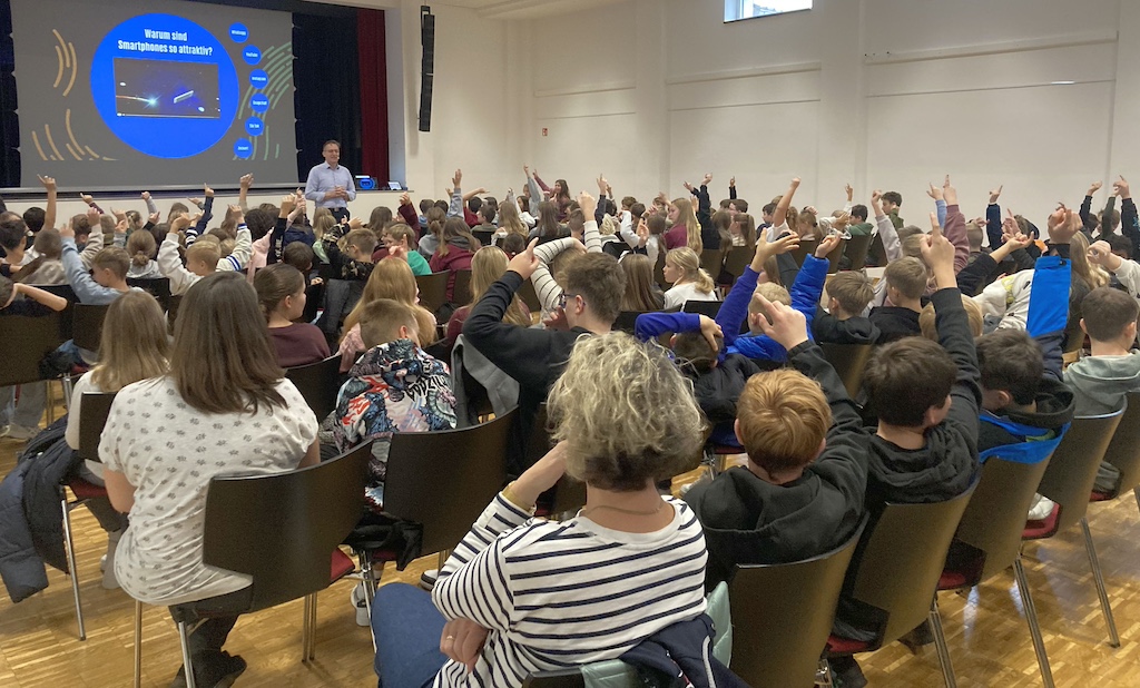 Daniel Wolff, renommierter und deutschlandweit gefragter Digitaltrainer und Medienpädagoge, informierte Schüler, Lehrkräfte und Eltern über die aktuellen Trends bei der Internet- und Smartphone-Nutzung und gab ganz konkrete Tipps für einen besseren digitalen Alltag in Schule und Familie. Der Tag begann mit den Workshops für die Schülerinnen und Schüler am Vormittag. Nachmittags gab es dann eine Fortbildungsveranstaltung für die Lehrkräfte und abends die Elterninformationsveranstaltung.