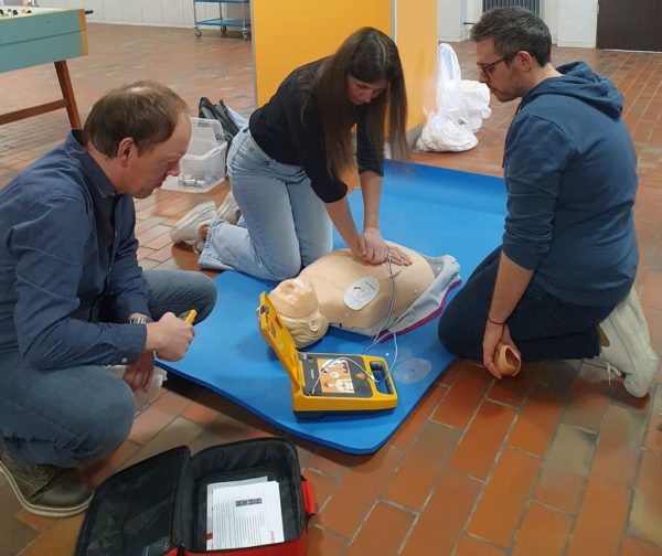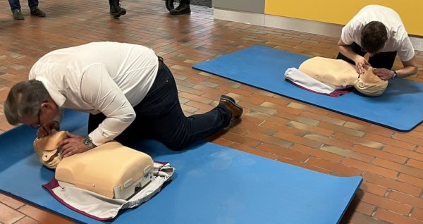 Ein weiterer Schwerpunkt war die Herz-Lungen-Wiederbelebung (HLW). Hierbei kamen mehrere Reanimationspuppen zum Einsatz, die Rückmeldung zur Drucktiefe und Frequenz gaben, sodass die Teilnehmenden ihr Vorgehen unmittelbar verbessern konnten. Die Einweisung in die Nutzung eines automatisierten externen Defibrillators (AED) war ebenfalls Teil der Einheit – ein Gerät, das auch an der LLR vorhanden ist und im Ernstfall lebensrettend sein kann.