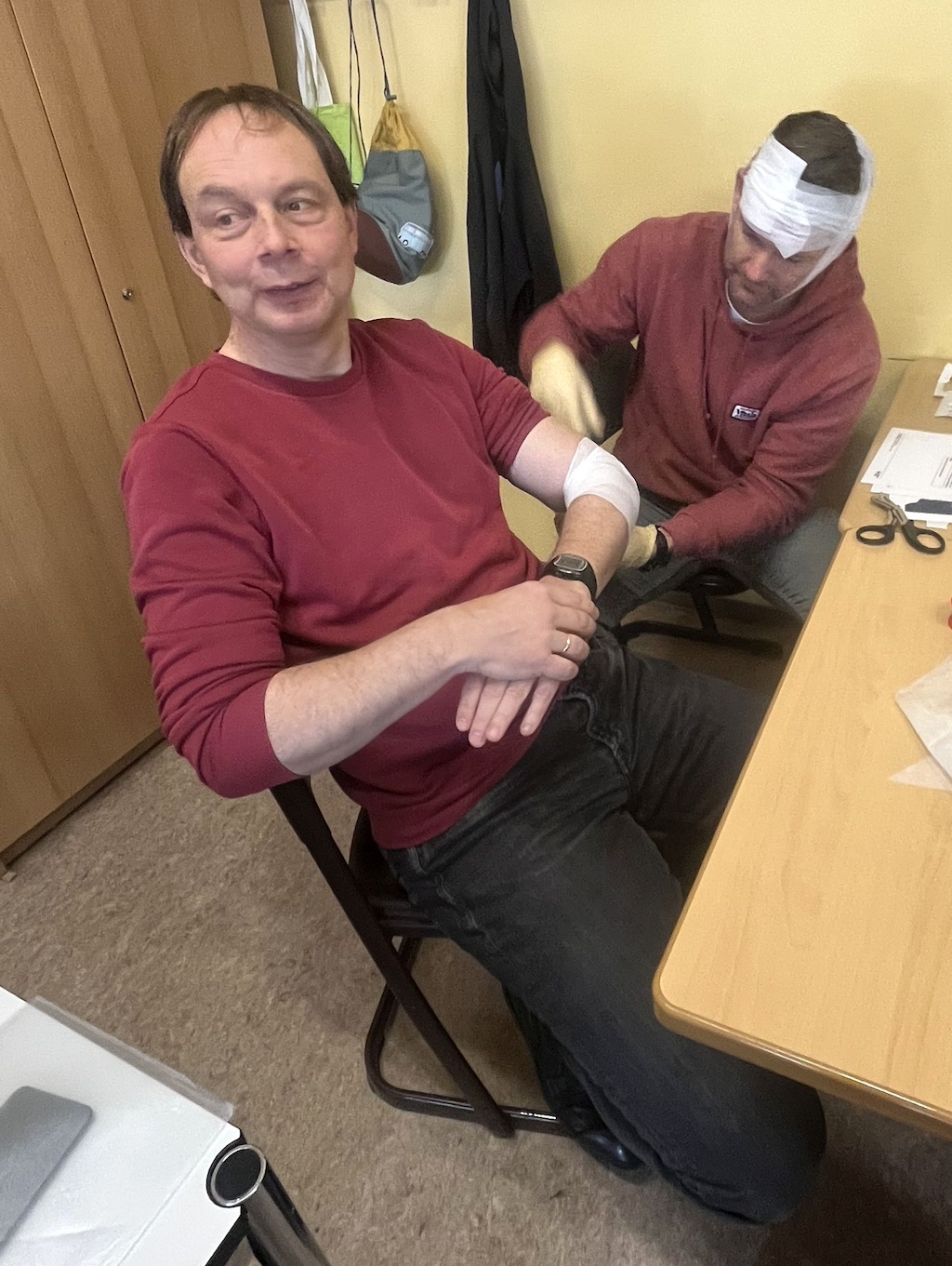 Der Kurs, der von Kai Weiß und Ronny Mergner – zwei erfahrenen Ausbildern des Bayerischen Roten Kreuzes – geleitet wurde, bot eine ausgewogene Mischung aus Theorie, praktischen Übungen und realistischen Szenarien. Gleich zu Beginn wurden grundlegende Kenntnisse vertieft: die Einschätzung von Notfallsituationen, das richtige Absetzen eines Notrufs sowie die stabile Seitenlage. Besonders wertvoll war für viele Lehrkräfte die Möglichkeit, diese Handgriffe mehrfach zu üben, bis sie sicher saßen.